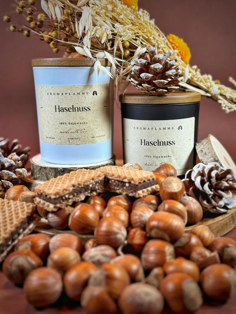 Ein warmer, sinnlicher Duft, der die köstliche Süße frisch gerösteter Haselnüsse einfängt. Sanfte Noten von Karamell und Vanille verschmelzen mit dem cremigen Aroma der Nuss zu einer harmonischen Komposition. Zarte Holznuancen verleihen Tiefe und Wärme – ein Duft, der Geborgenheit schenkt und jeden Raum in wohltuende Behaglichkeit taucht.